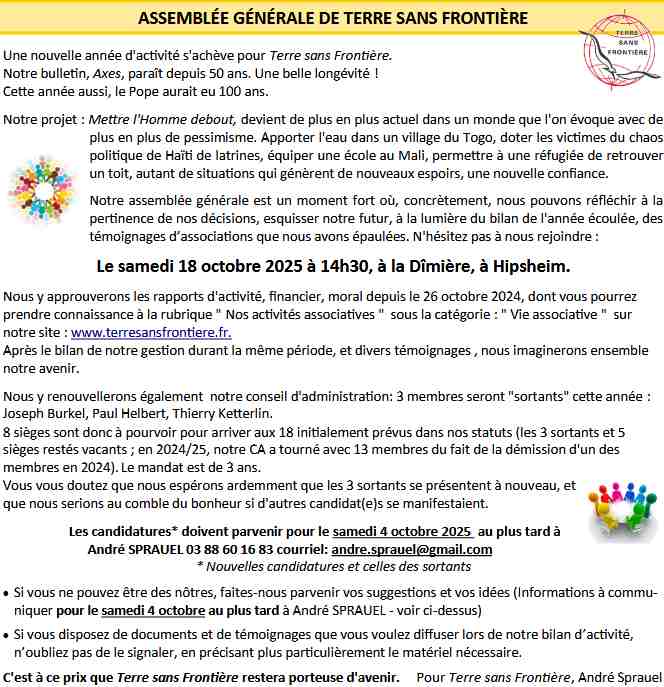 Vous êtes tous cordialement invités à l’Assemblée générale annuel de Terre sans frontière qui aura lieu